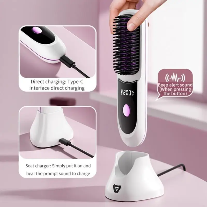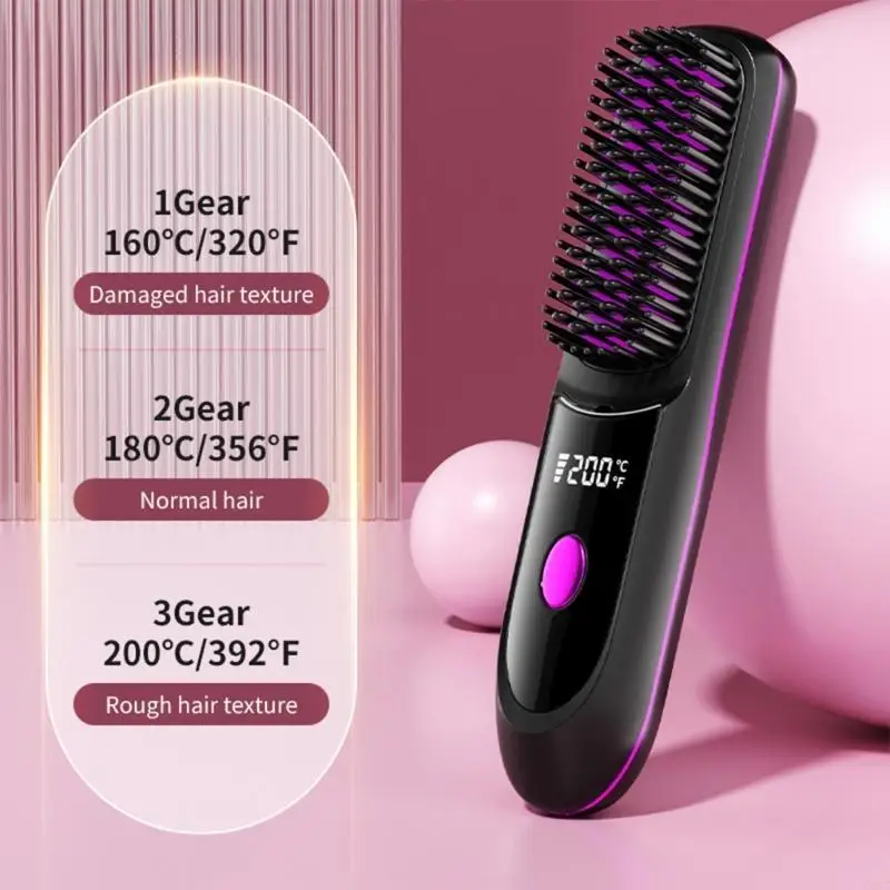 Cordless Hair Straightener Brush Fast Heating 3 Gear Adjustable Temperature USB Rechargeable Hair Straightening Comb